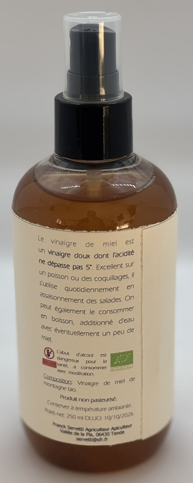 Vinaigre de miel non pasteurisé, sans sulfites. Le vinaigre de miel est un vinaigre doux dont l'acidité ne dépasse pas 5°. Excellent sur un poisson ou des coquillages, il s'utilise quotidiennement en assaisonnement des salades. Non pasteurisé on peut également le consommer en boisson, additionné d'eau avec éventuellement un peu de miel.
