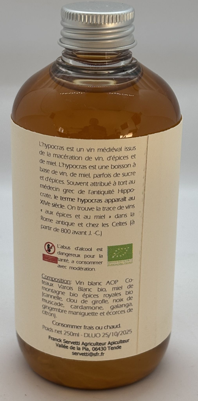Macération de vin blanc AOP coteaux Varois bio, miel de montagne bio et épices Royale bio. L’hypocras est un vin médiéval issus de la macération de vin, d’épices et de miel. L'hypocras est une boisson à base de vin, de miel, parfois de sucre et d'épices. Souvent attribué à tort au médecin grec de l'antiquité Hippocrate, le terme hypocras apparaît au XIVe siècle. On trouve la trace de vins « aux épices et au miel » dans la Rome antique et chez les Celtes (à partir de 800 avant J. -C.)