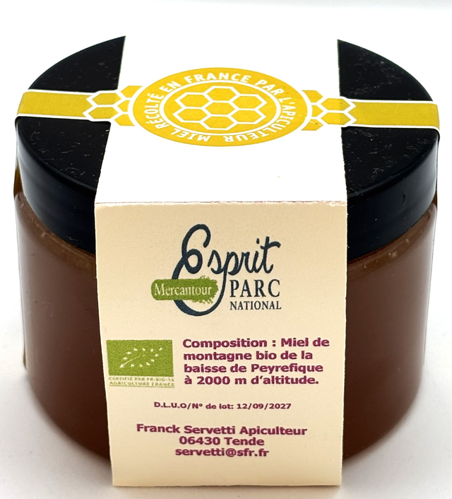 Miel de montagne biologique de Tende , vallée des merveilles. Le miel de montagne est généralement ambré, c’est un miel fortement aromatique de couleur ambré, c'est un miel de flore variée, récolté en moyenne ou haute montagne entre 800 et 2000 mètres d’altitude. Des saveurs pures, excellent pour la forme. Le miel de montagne est principalement issu de fleurs de sapin, d’acacia, de thym, de trèfles blancs, de framboisier sauvage, de lavande, d’églantier, de chardon, de campanules, de merisier, de houx, de trèfle, de châtaigniers, de bruyères, des fleurs de myrtilles, de rhododendron, de serpolet, de marjolaine, de Sainfoin, de ronce, de mélilot et des fleurs de prairies.