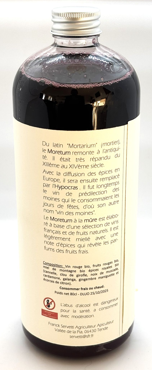 Préparation à base de vin rouge (merlot) fruits rouges, miel de montagne et épices royales. Du latin "Mortarium" (mortier), le Moretum remonte à l'antiquité. Il était très répandu du XIIIème au XIVème siècle. Avec la diffusion des épices en Europe, il sera ensuite remplacé par l'Hypocras. Il fut longtemps le vin de prédilection des moines qui le consommaient les jours de fêtes, d'où son autre nom "vin des moines". Le Moretum à la mûre est élaboré à base d'une sélection de vins français et de fruits naturels. Il est légèrement miellé avec une note d'épices qui révèle les parfums des fruits frais.